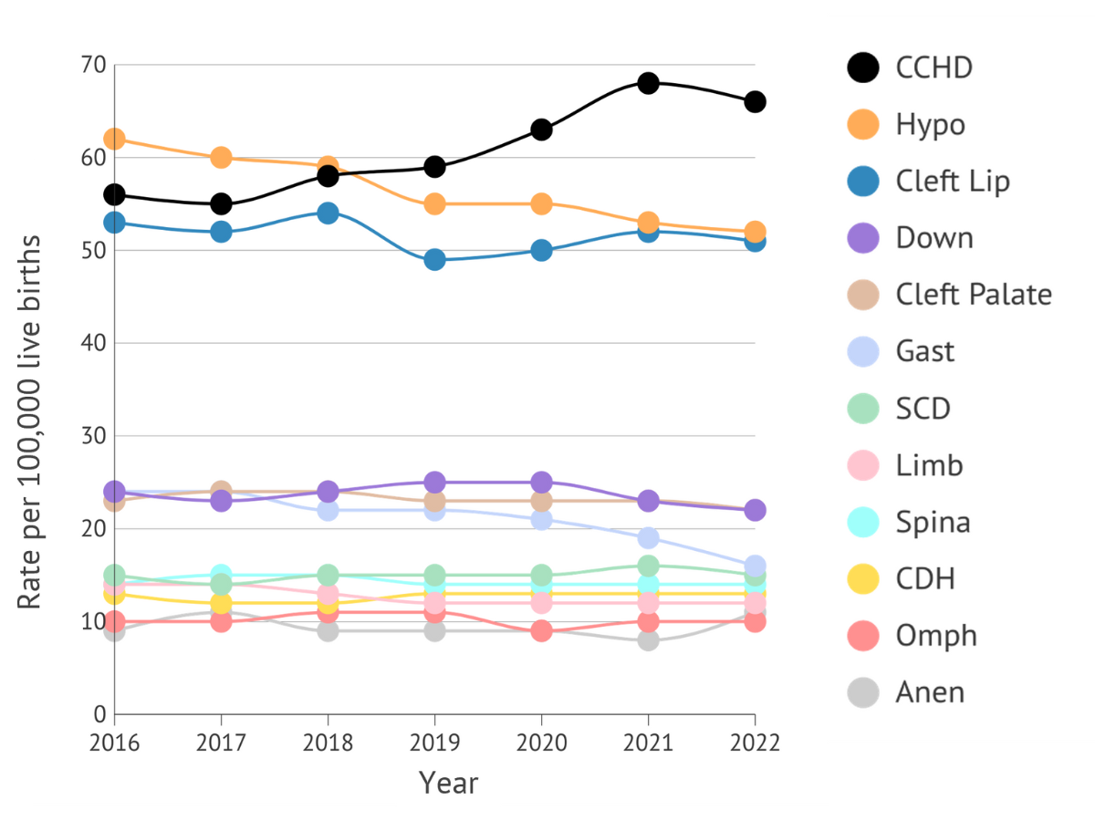 CCHD accounts for 20% of birth defects and its rate increased 19% from 2016 to 2022